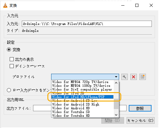 表示される画面に、「プロファイル」から「Video for iPod HD/iPhone/PSP」を選択して、「参照」から保存先を指定します。