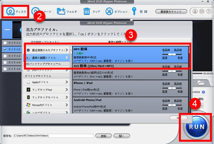 - ❹ 解像度や画質などの設定や細かい操作設定は基本デフォルトで良いと思います。最後は右下の「RUN」を押してDVDのコ変換が始まります。「完了」と表示されれば成功です。