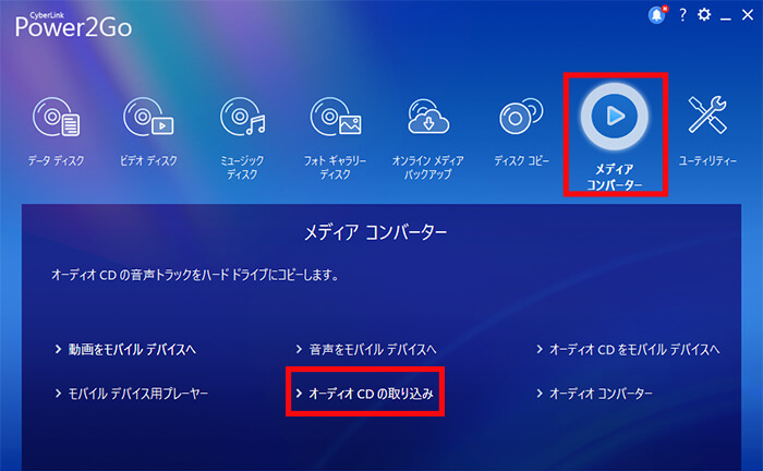 ➋.「メディアコンバーター」⇒下段から「オーディオCDの取り込み」をクリックします。