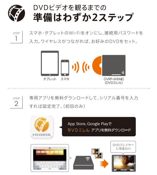 モデルによって、Wi-Fiタイプと有線タイプがあります。それぞれiPadに接続して、DVDをiPadで再生する方法を説明します。