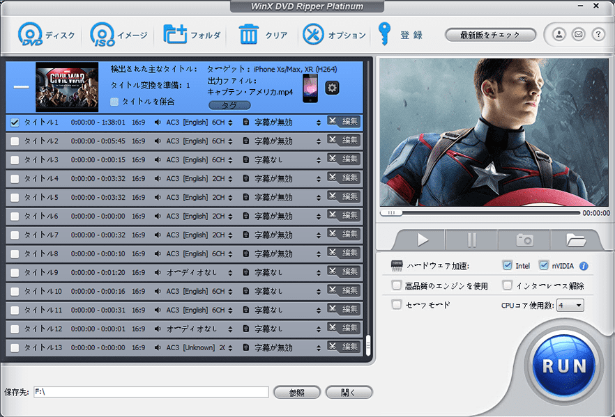 業界最速のDVDリッピングソフト:専属のハードウェアアクセラレーション レベル-3技術により、Intel Core i5/i7 CPU, GeForce GTX 1080 Tiなどを活用できます。またスピード、出力品質とファイルサイズの間の完璧なバランスを取り、リアルタイムより32倍速く、最大限500fpsをに達することができます(DVDドライブの速度により)。 マルチコアCPU、MMX-SSE&3DNow!技術に基づくスーパーエンコードエンジン、ハイパースレッディング技術により、長編DVD映画を完全なコンテンツ、オリジナル画像のアスペクト比を維持しながら、リッピングするにはただ5分間!内容および元のイメージの縦横比は完全に保つことができます。