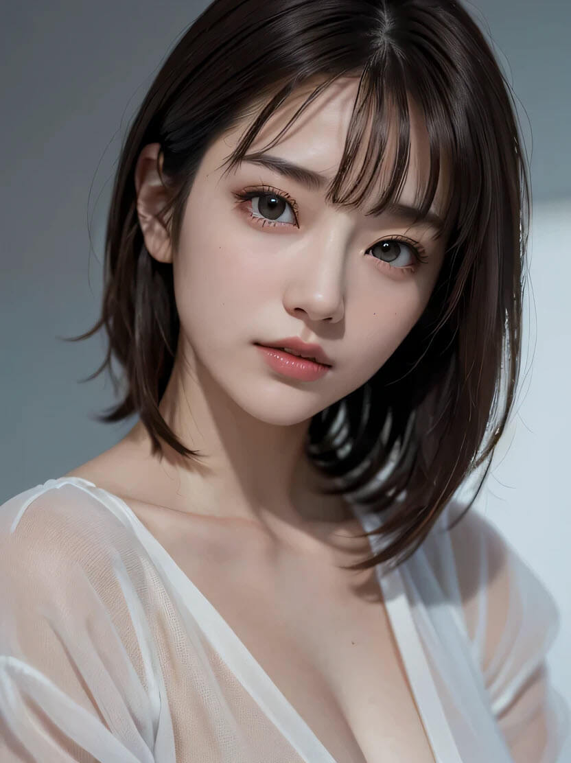 AI画像生成グラビアのプロンプト:((傑作、最高品質、超詳しい、高解像度、鋭い焦点、映画のような照明))、(女性1名、ミドルショット、フェイスライト))、30歳、小顔、ノーメイク、(細かい目)、緻密な美しい目、前髪、濃い茶色の髪、ボーイッシュなショートカットの髪、(リアルな肌)、美しい肌、(詳細な衣服の特徴)、簡単な衣装、開いた白いシャツ、真ん中の胸、クールビューティー、灰色の背景、ティファ_ロックハート