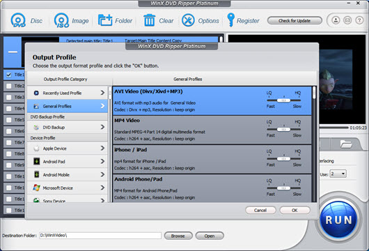 WinX DVD Ripper Platinum: Version avancée du libre WinX DVD Ripper. Outre la conversion de DVD en AVI à la vitesse la plus rapide avec une excellente qualité, aussi la conversion de DVD en MP4, MPEG, MOV, WMV, FLV, M2TS, TS, iPhone, iPod, iPad, Android, Samsung, HTC, Microsoft, Google, Sony, Nokia, Asus, Acer, etc. rend parfait 1: 1 DVD ISO image / DVD copie du dossier et clone DVD en fichier MPEG2 multi-piste avec cinq minutes seulement. Constamment mis à jour pour vaincre venir protections contre la copie de DVD.