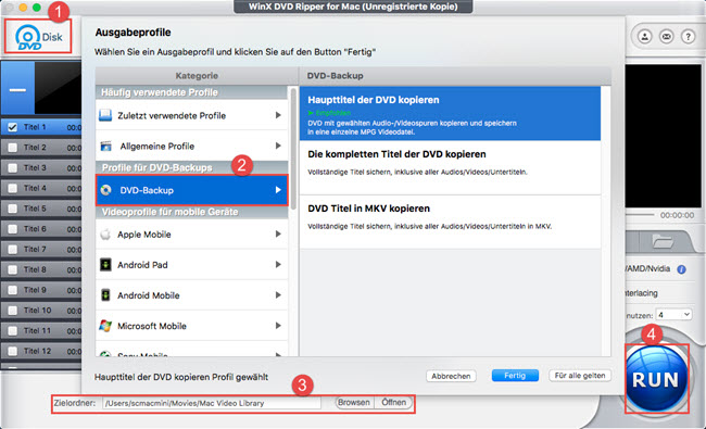 WinX DVD Ripper for Mac ist ein vielseitiger Mac DVD Ripper der Ihnen hilft, DVDs zu rippen in iTunes, MP4, MKV, MOV, FLV, AVI, MPEG, MP3, etc, und in kompatible Videoformate für iPhone, iPod, iPad Pro/mini/Air, Apple TV, Android, WP8, Chromecast, PSP usw. Darüber hinaus bietet die 1:1 Kopierfunktion die beste Möglichkeit DVD Kopien auf der Festplatte oder USB-Stick anzufertigen. Und mit diesem Mac DVD Ripper lassen sich kopiergeschützte DVDs konvertieren, z.B. Mission: Impossible - Fallout, Solo: A Star Wars Story, Avengers: Infinity War, Jurassic World: Das gefallene Königreich, Deadpool 2, Star Wars - Die letzten Jedi, Thor - Tag der Entscheidung und so weiter!