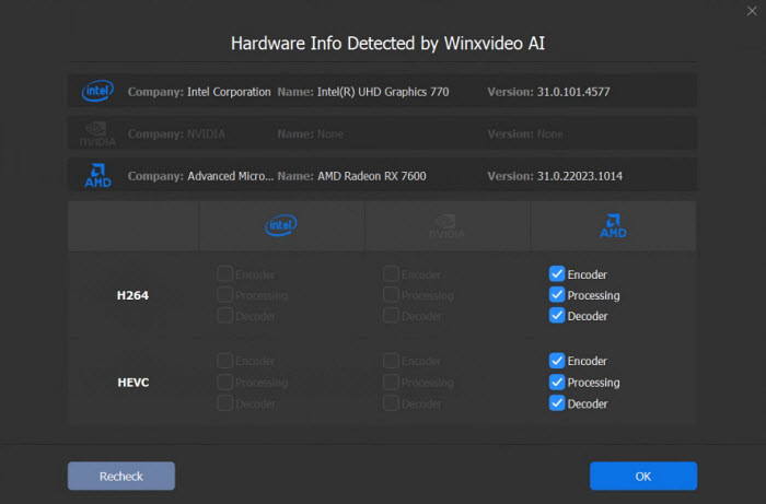4 Enable hardware acceleration: Choose to enable Nvidia/Intel/AMD hardware acceleration engine to accelerate the video processing speed at most. Winxvideo AI will auto check your computer hardware info. Click "Option" button to check it.