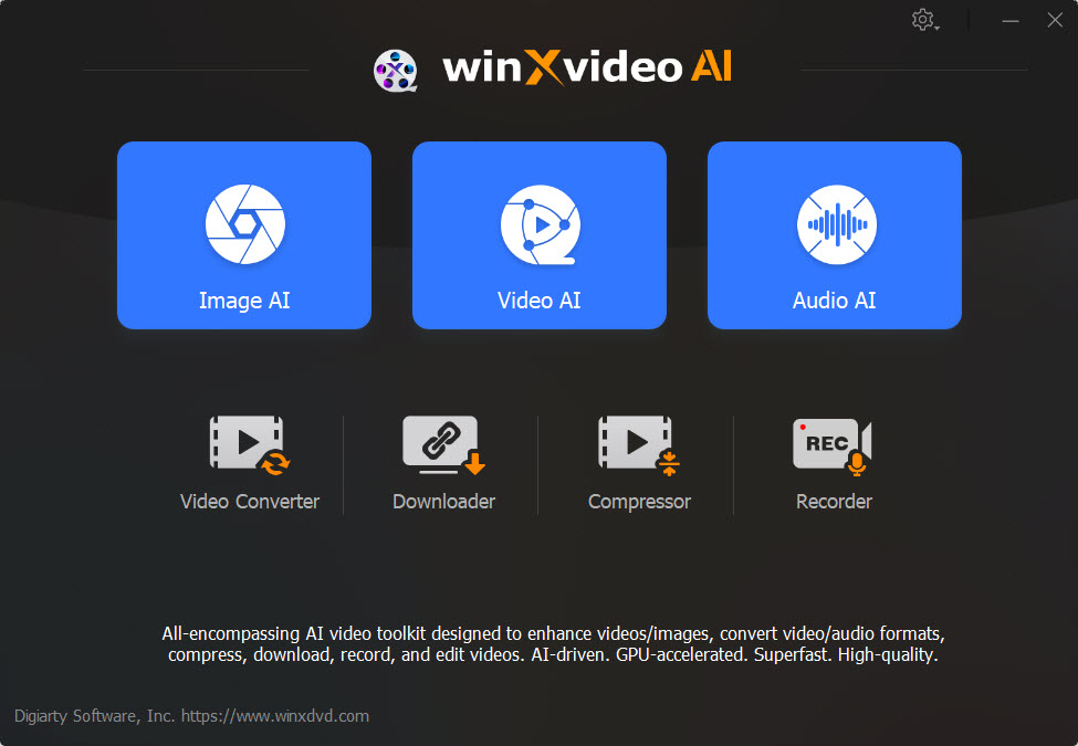 5 Launch WinX (trial version) and you will see the main interface as below, with 6 sections provided - Video AI, Image AI, Audio AI, Video Converter,Downloader, and Recorder.