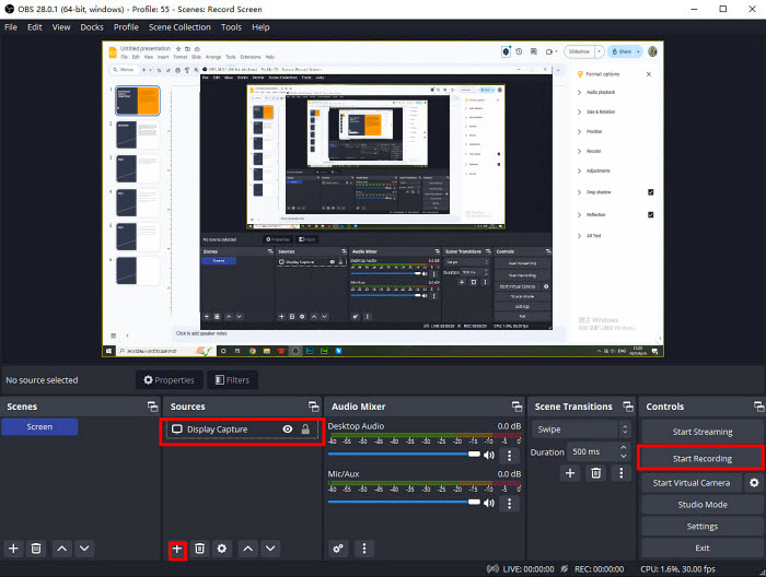 By default, OBS Studio will record the screen of Google Slides together with desktop audio. In case you only need to record audio on Google Slides in an audio file, you can disable the visual capture by checking the eye icon to the right of the added source.