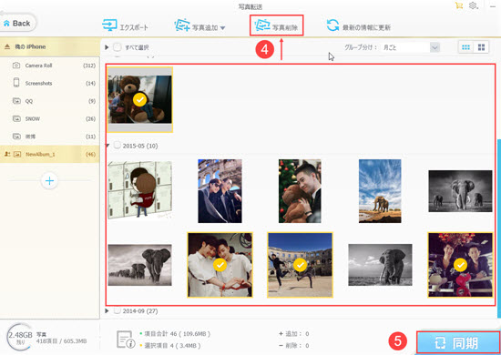 画像選択の裏ワザ:「すべてを選択する」にチェックを入れたら、iPhoneにあるすべての画像が選択されます。キーボードの左下にある「Ctrl」キーを押しながら、マウスで必要な写真をクリックして、複数のものを同時に選択できます。また、日/月/年により分類した一覧表に、時間の前にある空白の□にチェックを入れたら、この時間で撮った写真と保存した画像がすべて選択されます。右を指す▲あるいは時間をクリックすればこの時間で撮った写真と保存した画像がすべて表示します。