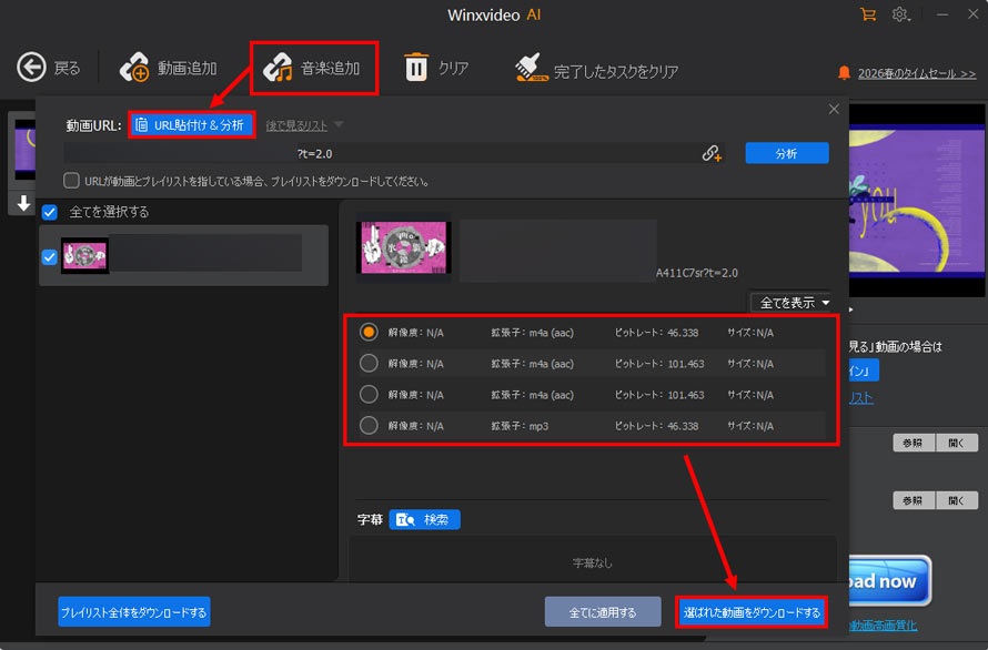 すると、ソフトが自動で分析を開始します。分析が完成したら、利用可能な音楽のフォーマットや品質から目的にチェックを入れて、「選ばれた動画をダウンロードする」をクリックします。