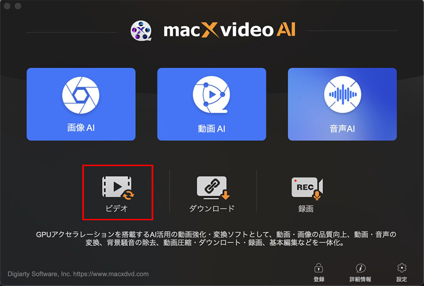 まずはMacxvideo AIをダウンロードして、インストールします。起動して、ご覧のように見えます。
