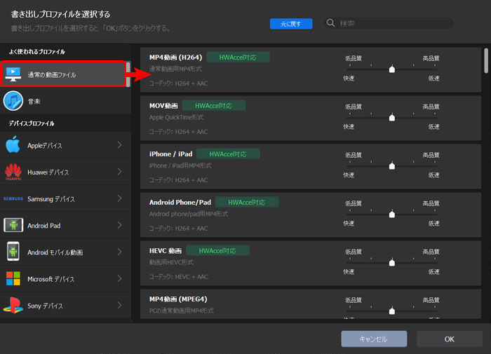 「フォーマット」アイコンをクリックし、書き出しプロファイル画面が表示されます。そして、「通常の動画ファイル」→「MP4動画」→「OK」という順で選択します。
