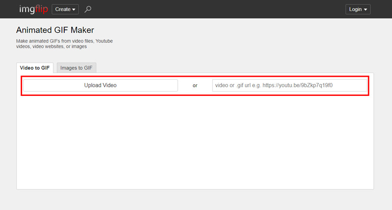 - ❶ 公式サイトを開いて、「Video to GIF」>「Upload Video」をクリックし、URLを貼り付けて動画を追加します。