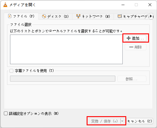メニューから「メディア」をクリックして、「変換/保存」をクリックしてファイル変換機能を起動します。