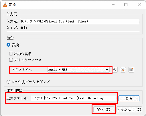 出力ファイルに、ファイル名の後に「.mp3」という拡張子を入力します。