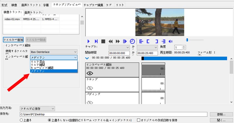 - 「使用するフィルター」には「libav Deinterlace」「Yadif」「KernelDeint」「mcDeInterlace」の4種類があります。フィルターの選び方は適用する効果によって違います。実際に試してみてください。